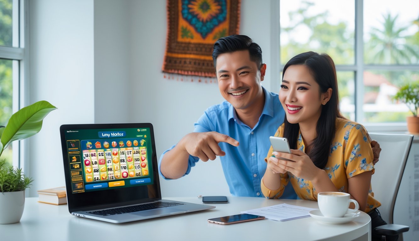 Seorang pria dan wanita duduk di meja dengan laptop, terlihat bersemangat menggunakan layanan togel online di rumah.